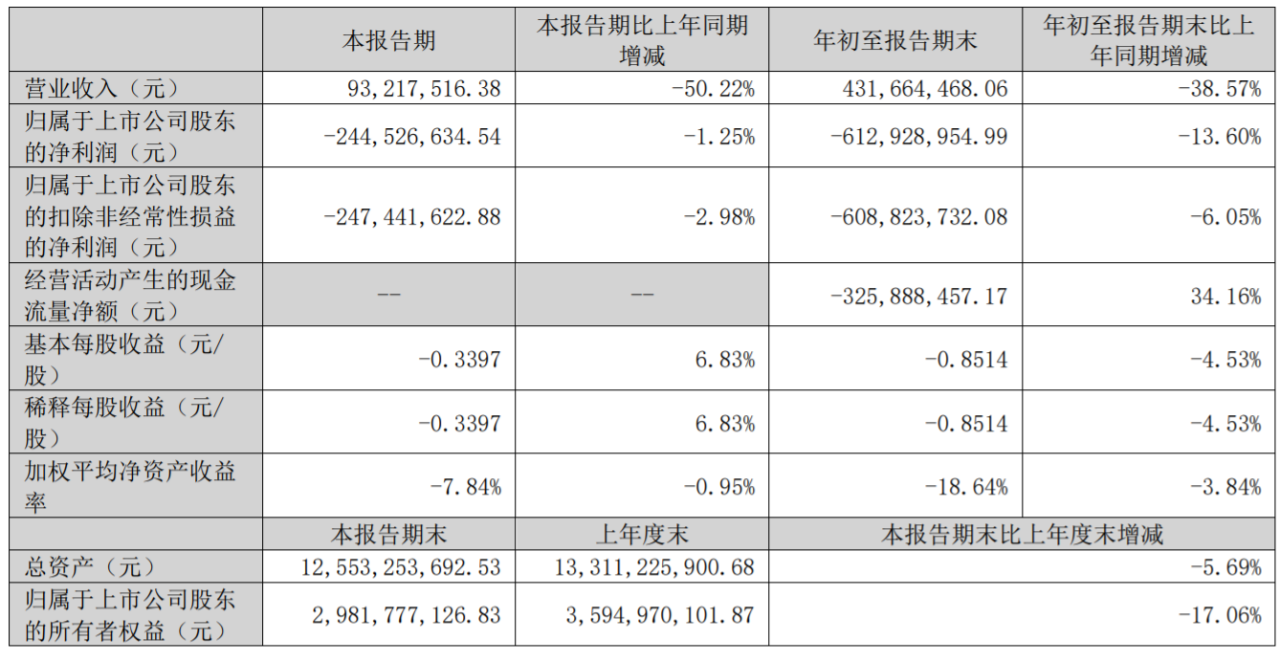 10月29日,易华录(300212.SZ)发布2024年第三季度报告,前三季度公司实现营业收入4.32亿元,同比下降38.57%;归属于上市公司股东的净利润亏损6.13亿元。第三季度公司实现营业收入9321.75万元,同比下降50.22%;归属于上市公司股东的净利润亏损2.45亿元。